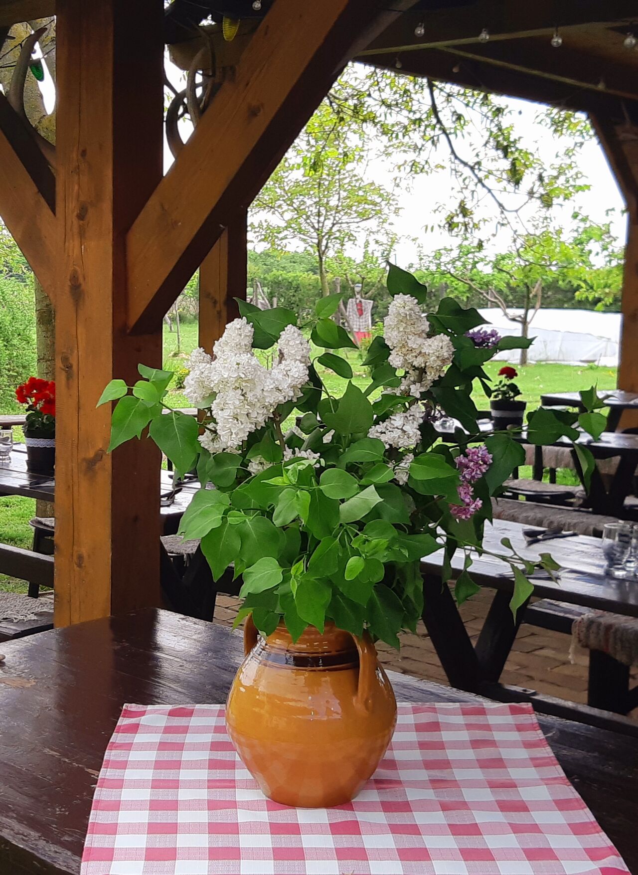 Rusztikus nosztalgikus berendezés és hangulat. Hatalmas udvarunk van, sok fával, virággal.