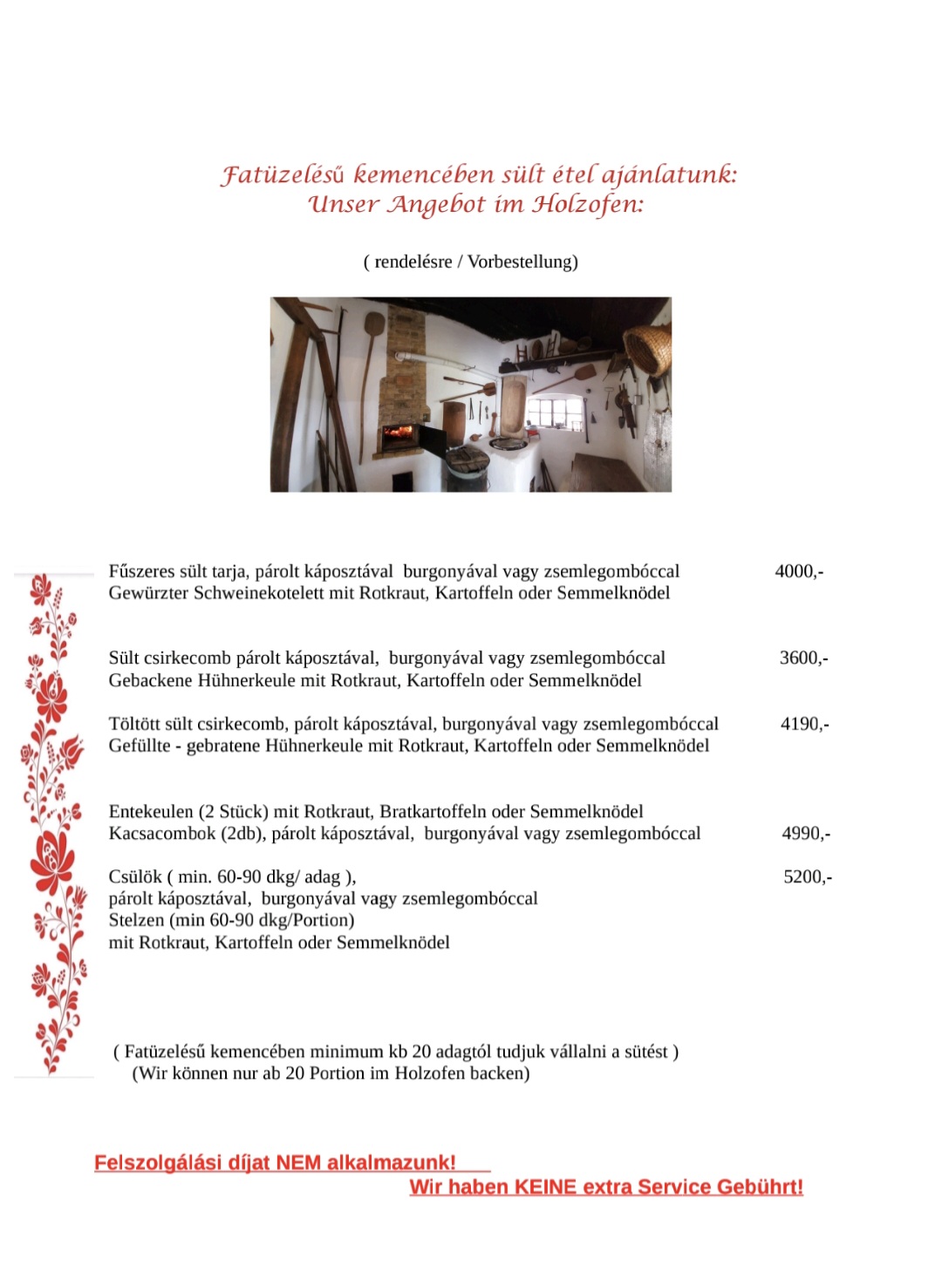 Specialitásunk a magyar pörkölt / gulyás, és a több mint 100 éves kemencében készült sült húsok csülök, csirke, liba, kacsa rendelésre történő sütése.